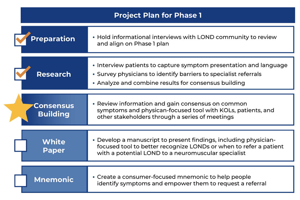 Our next step is to draw from these research efforts and work to gain alignment across stakeholders on the presenting symptoms that differentiate LONDs from more common diagnoses and identify the diagnostic triggers that should signal the potential presence of a late-onset neuromuscular condition.